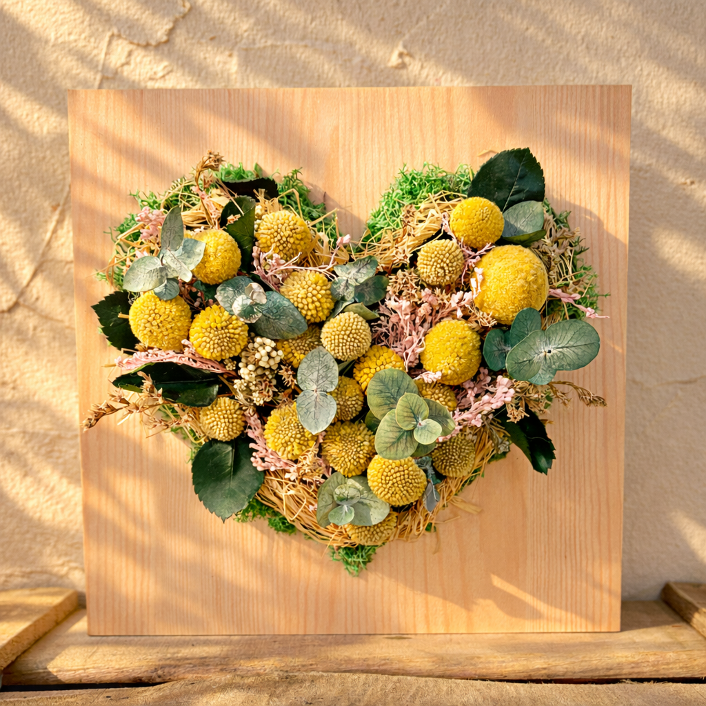 Un corazón que no se marchita. 💛🌿 Composición floral en forma de corazón, con craspedias, eucalipto y flores preservadas sobre base de madera. Un detalle lleno de luz… ✨